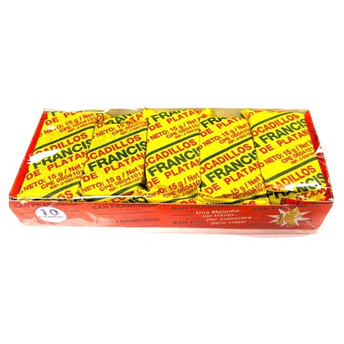 Bocadillos de Plátano en presentación por paquete de 10 unidades.